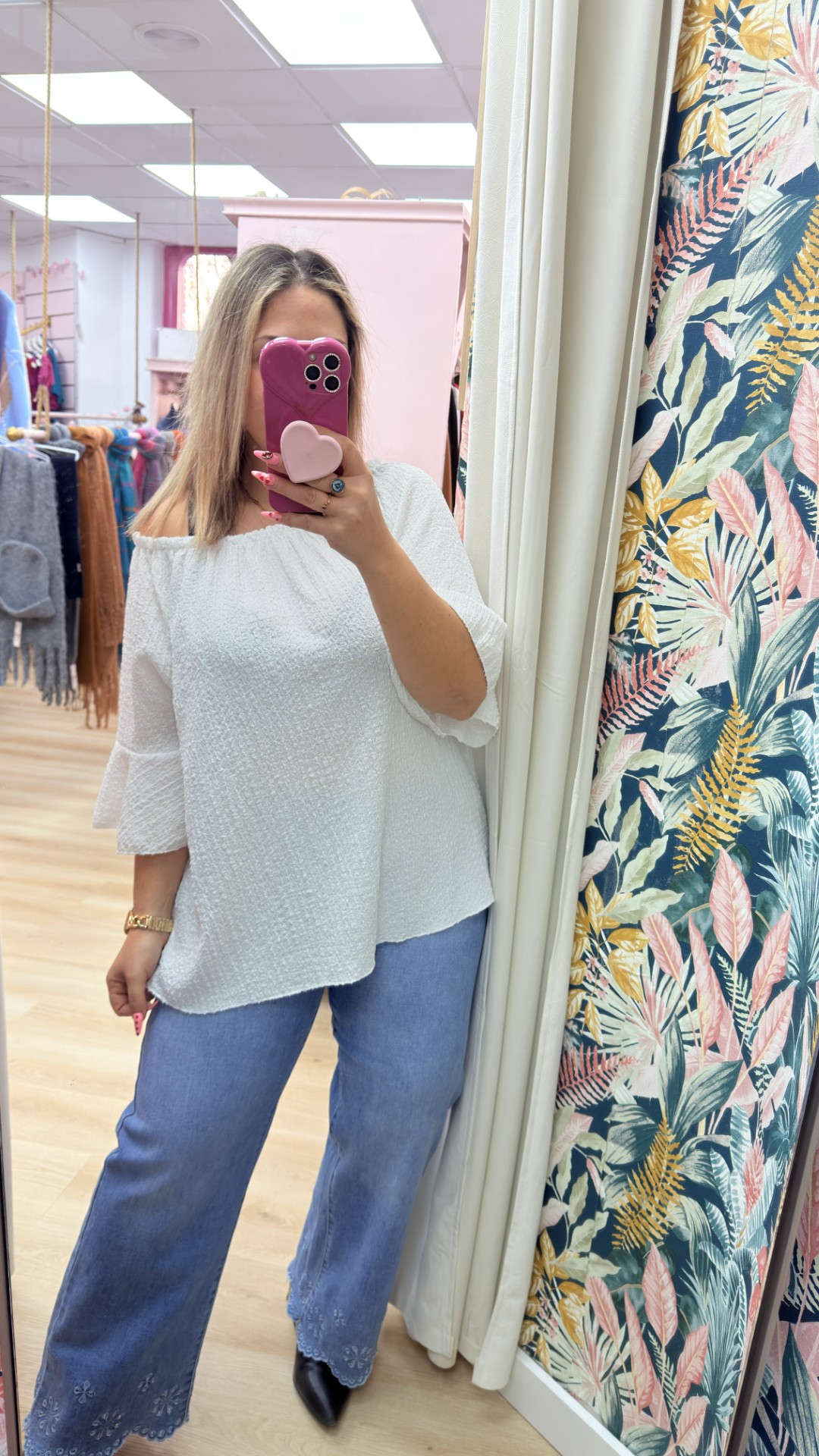 Blusa elastica con tejido con textura elastica, cuello con rizo y manga acampanada