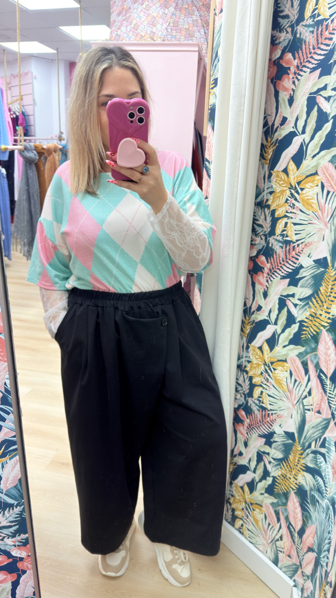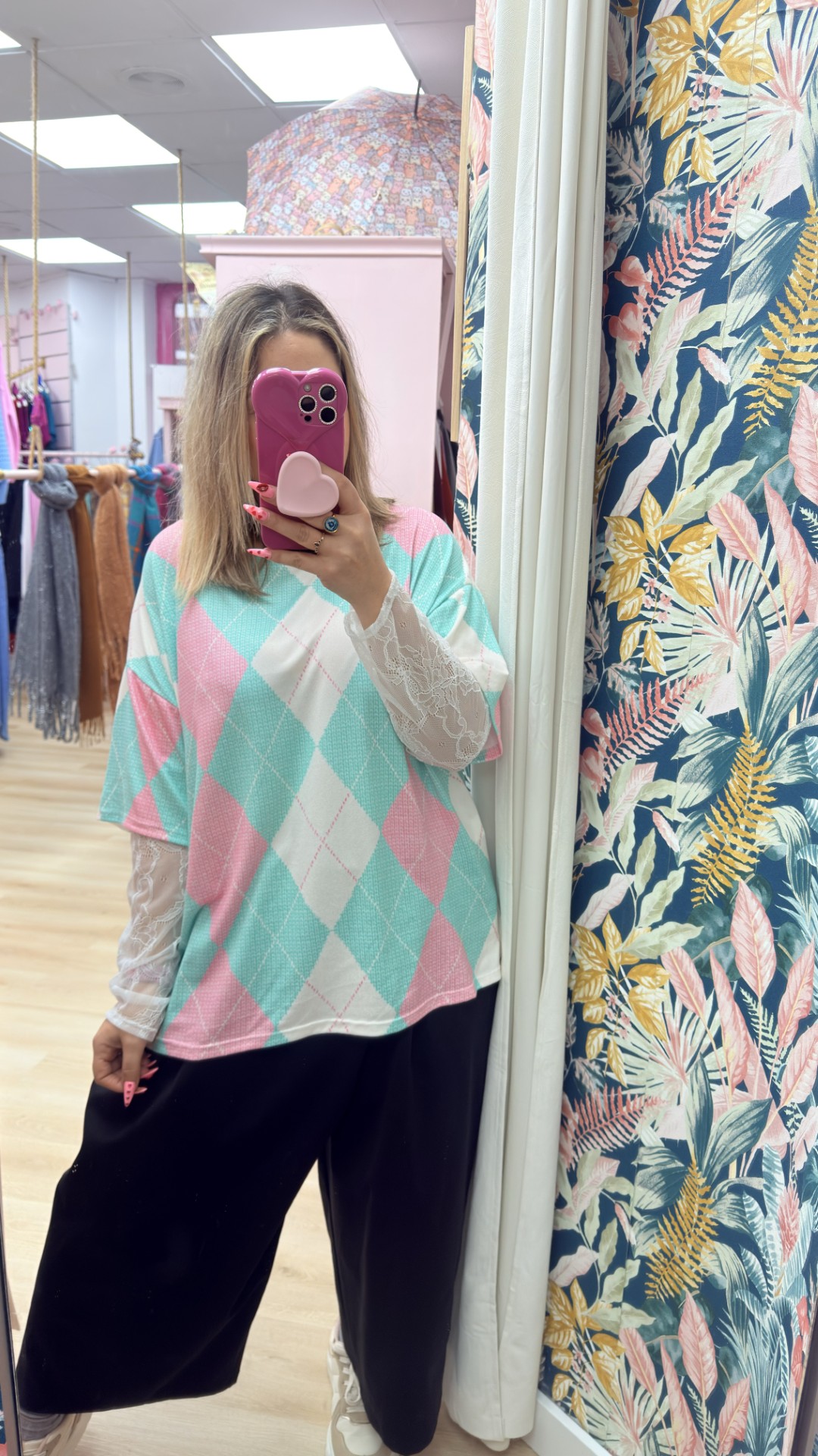 Camiseta rombos verde agua manga encaje