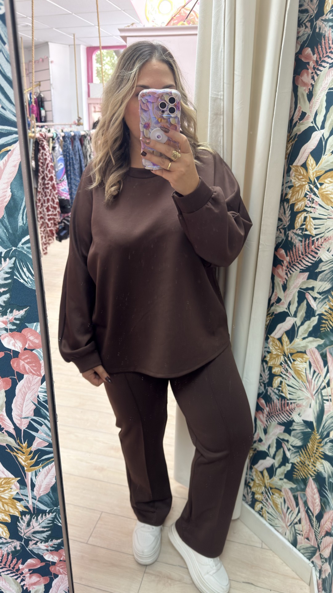 Conjunto elastico de punto grueso. Sudadera ancha y pantalon tipo recto, con linea y bolsillos